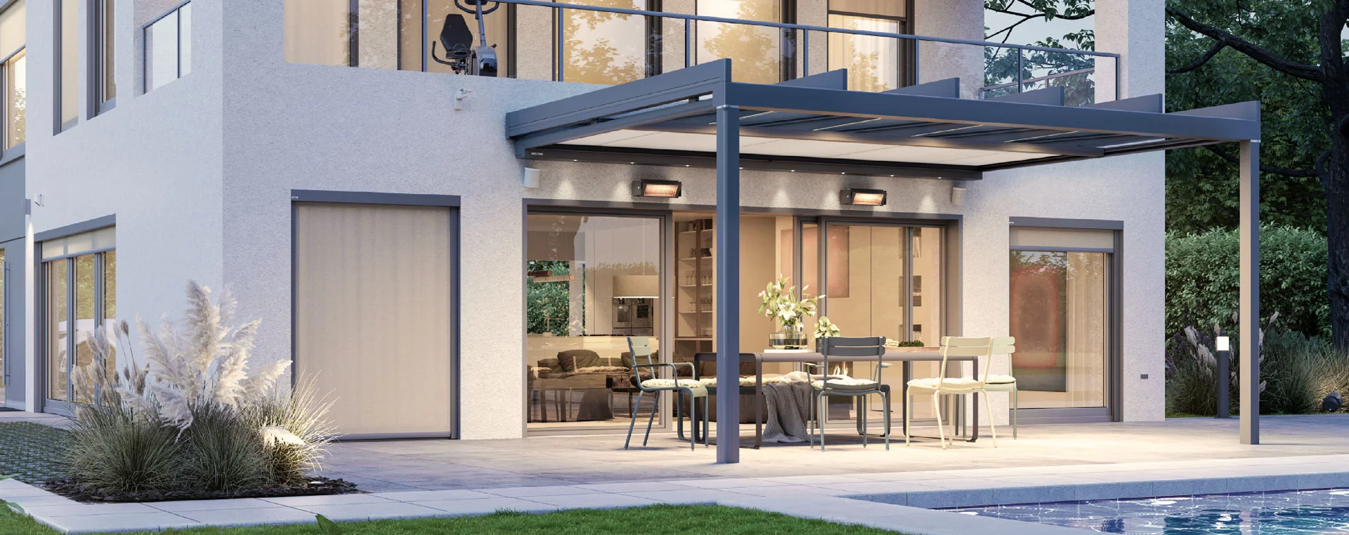 De pergolazonwering Plaza Viva combineert bescherming met de flexibele, luchtigheid van textiel, waardoor u de zomerse wind voelt en er een open ruimtelijk gevoel ontstaat.